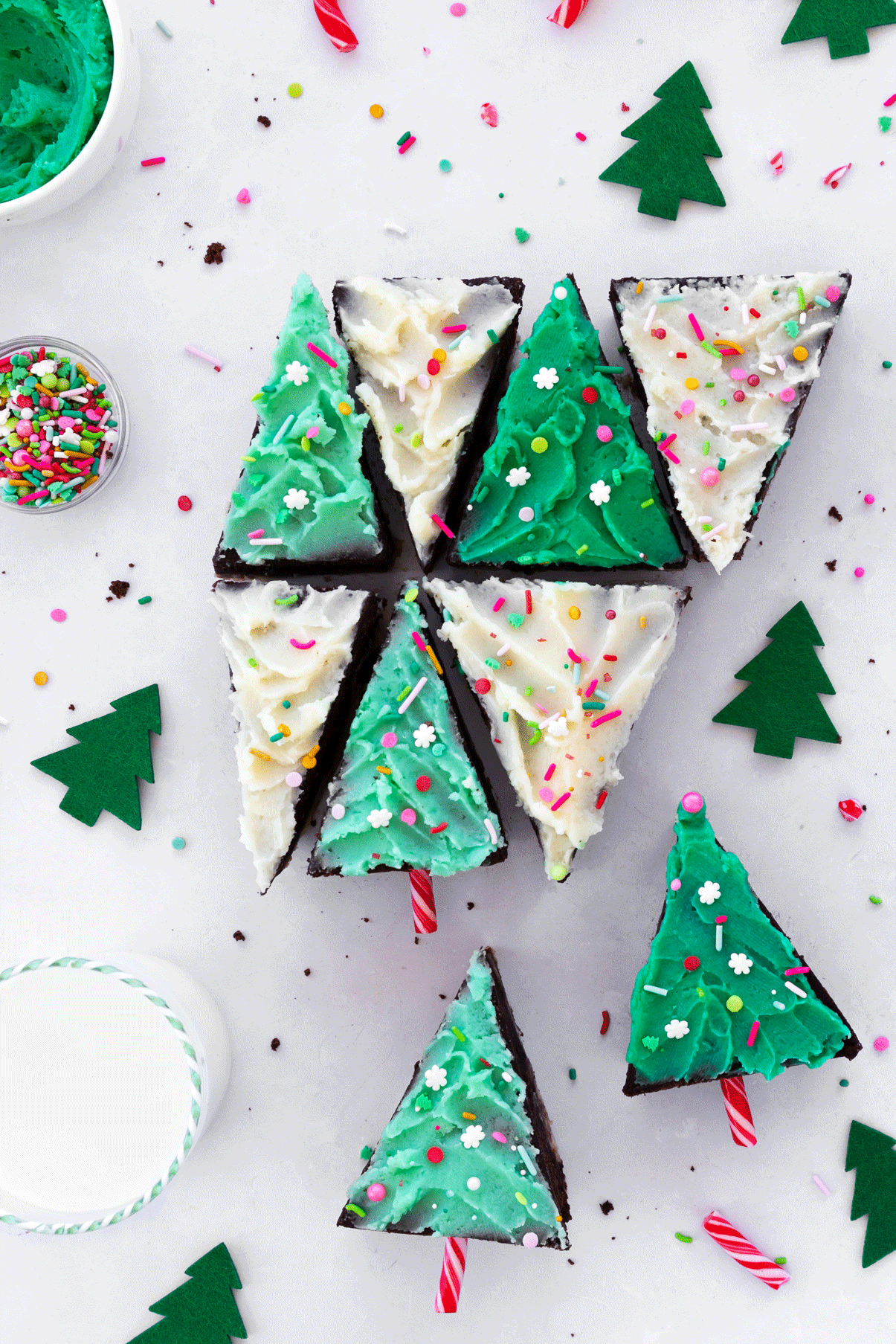 - Decorate trees by placing green melted chocolate into a piping bag. Top with assorted sprinkles. Place a 3-inch piece of candy cane in the bottom of the brownie for the stump
