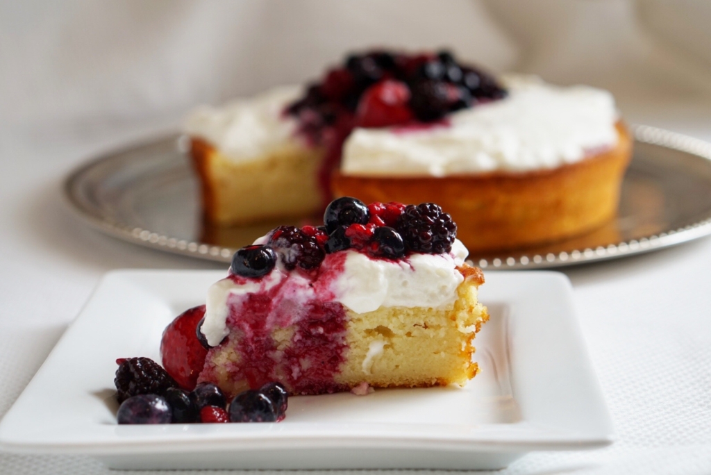 - To serve, cut cake into wedges. Spoon whipped cream and berries on each wedge. Serve immediately. Cover and refrigerate any leftover cake.
