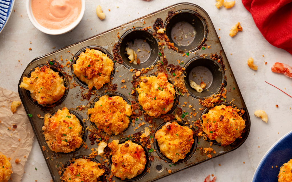 - In a large bowl, combine macaroni, cheese sauce and lobster and stir well. Spoon mac and cheese into a well-greased muffin tin. Top each “muffin” with a sprinkle of breadcrumbs.