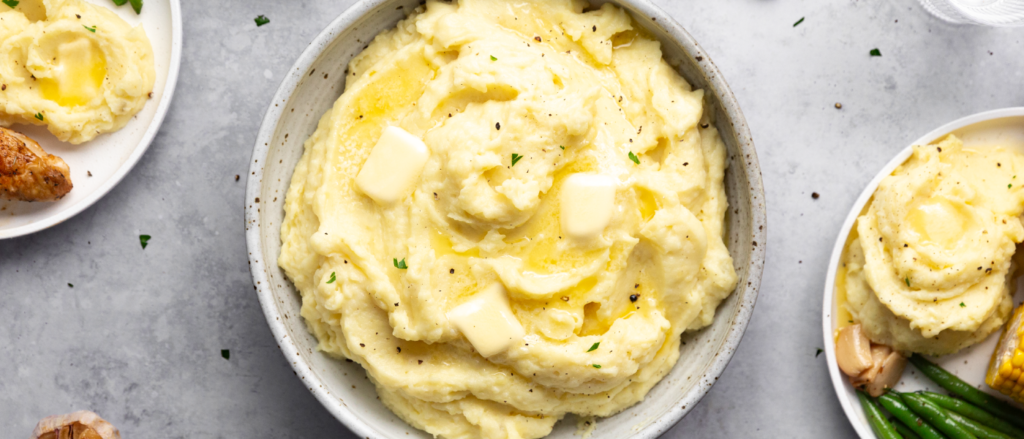 Indulge in the cozy and flavorful embrace of our Creamy Herby Roasted Garlic Mashed Potatoes. These spuds are more than just a side dish; they’re a delightful blend of rich, buttery mashed potatoes infused with the warm essence of roasted garlic. Creaminess is the hero here, thanks to the silky touch of milk or half-and-half and the tangy depth of sour cream. To top it all off, it’s topped with a sprinkle of fresh parsley and a pad of (melting) butter.