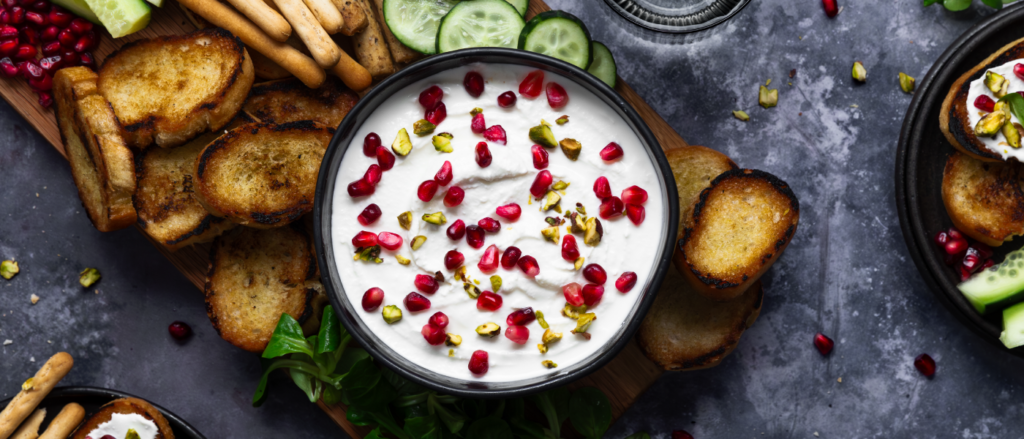 - To serve, transfer the whipped feta to the chilled serving bowl. Top with pomegranate and pistachios. Serve with cut veggies, lamb leaf lettuce or arugula, baguette, crostini, breadsticks, or pita bread, along with additional pistachios and pomegranate arils on the side.